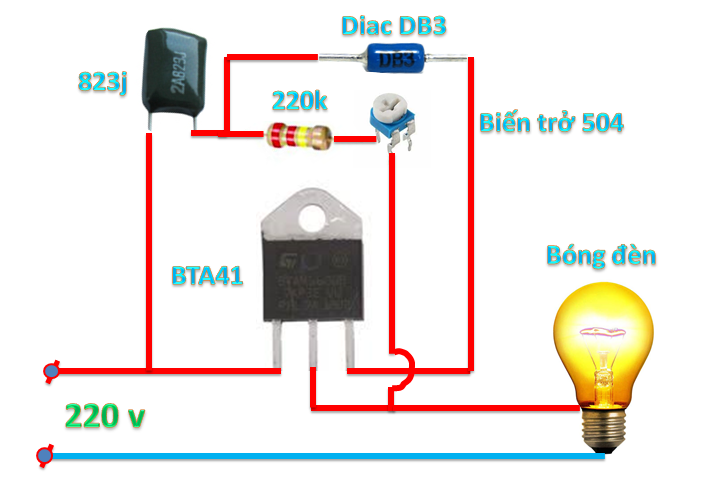 Các bạn sẽ ráp theo mạch điện tử đơn giản này. Ngõ ra của mạch các bạn sẽ gắn với bóng đèn sợi đốt để test ngõ ra, các bạn sẽ chỉnh biến trở để đèn sáng dần từ mờ tới sáng tỏ, các bạn mắc đồng hồ vạn năng song song với bóng đèn để đo điện áp hiệu dụng, nếu điện áp này đạt 110v là đạt yêu cầu.