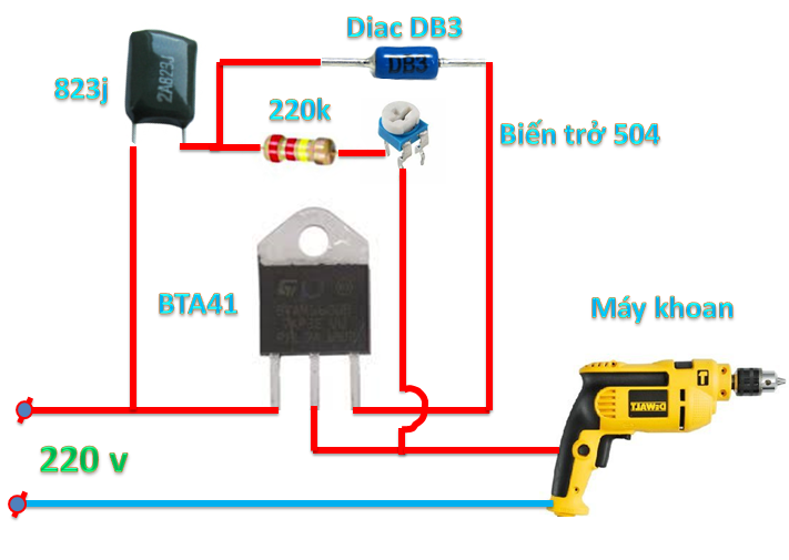 Cũng với mạch điện như trên các bạn tháo bóng đèn và gắn khoan vào thay thế, các bạn chỉnh biến trở và kiểm tra điện áp ra là 110v, ít nẹt lửa ở cổ gióp của máy khoan là hoàn tất.