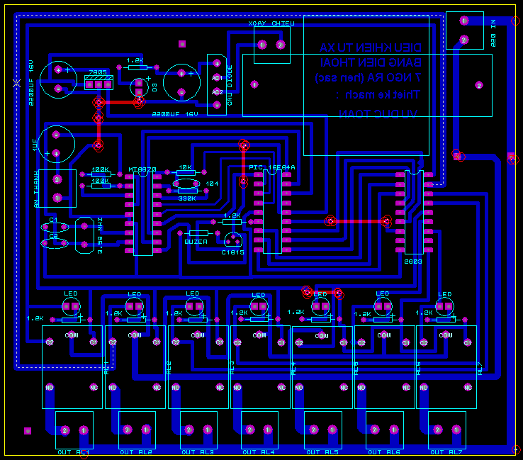 Trong hình này các bạn sẽ nhìn thấy các đường màu đỏ , đó chính là các đường jump nối phía mặt trên của mạch điện. Đương nhiên các bạn vẫn làm mạch in 1 lớp thủ công , và các jump nối phía trên chúng ta sẽ sử dụng dây đồng nhỏ để đi đường mạch phía trên.